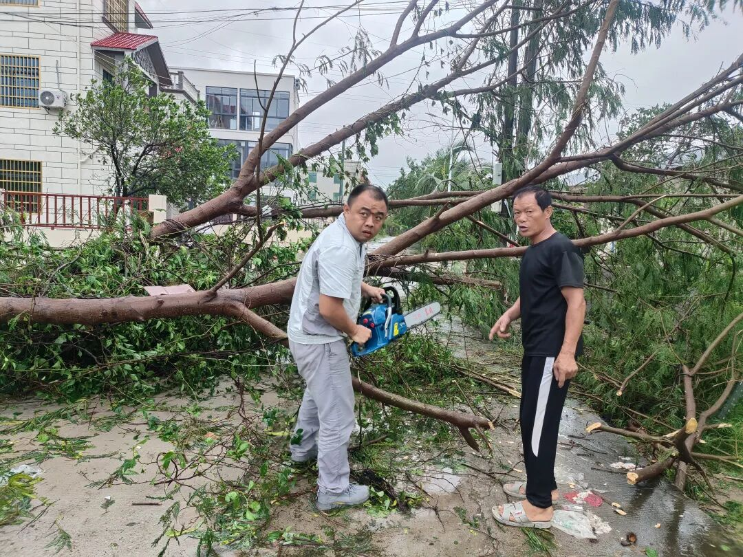 邢瀚天(右一)正在處理殘枝斷樹,為災(zāi)后重建工作“開路”