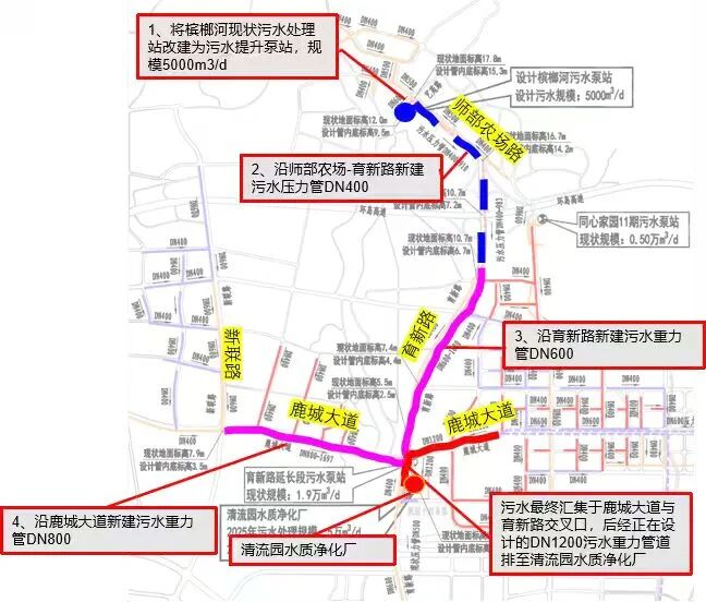 該項目的實施,將解決該片區(qū)污水管道終端出處的問題,撤除檳榔河現(xiàn)狀臨時污水處理站,新建規(guī)模為5000m3/d的污水提升泵站,并在師部農(nóng)場路、育新路及鹿城大道擴容升級污水管道,將檳榔河片區(qū)及妙林片區(qū)的污水轉(zhuǎn)輸接入育新路污水提升泵站,近期排入荔枝溝水質(zhì)凈化廠處理,遠期經(jīng)育新路污水主管道接入清流園水質(zhì)凈化廠處理,全面解決以往污水處理能力不足、污水集中收集率不高等問題,改善周邊群眾的生活環(huán)境。